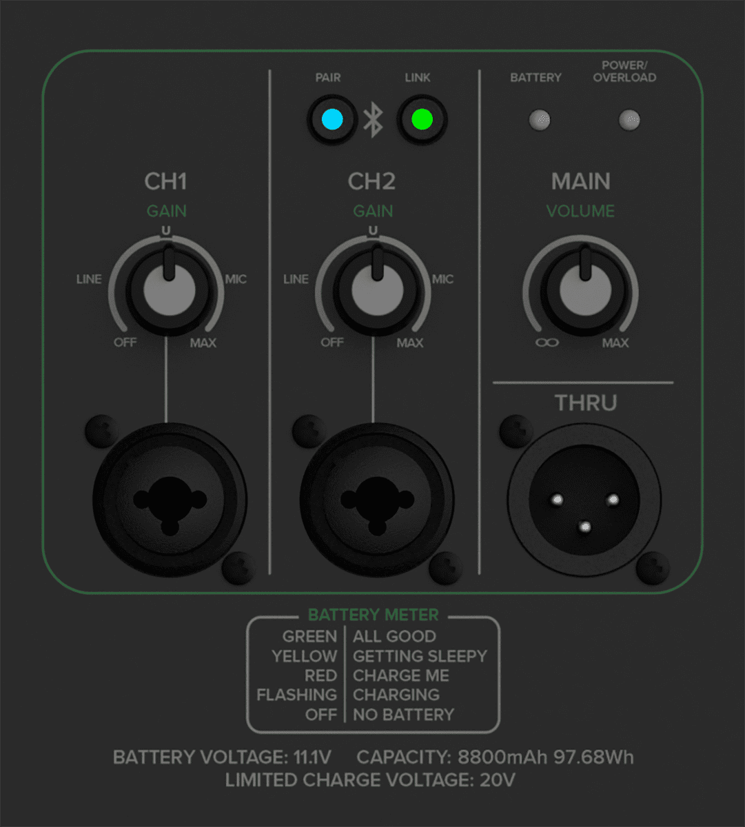 Contrôles : Gain Ch1, Gain Ch2, Main Volume, Appairage Bluetooth